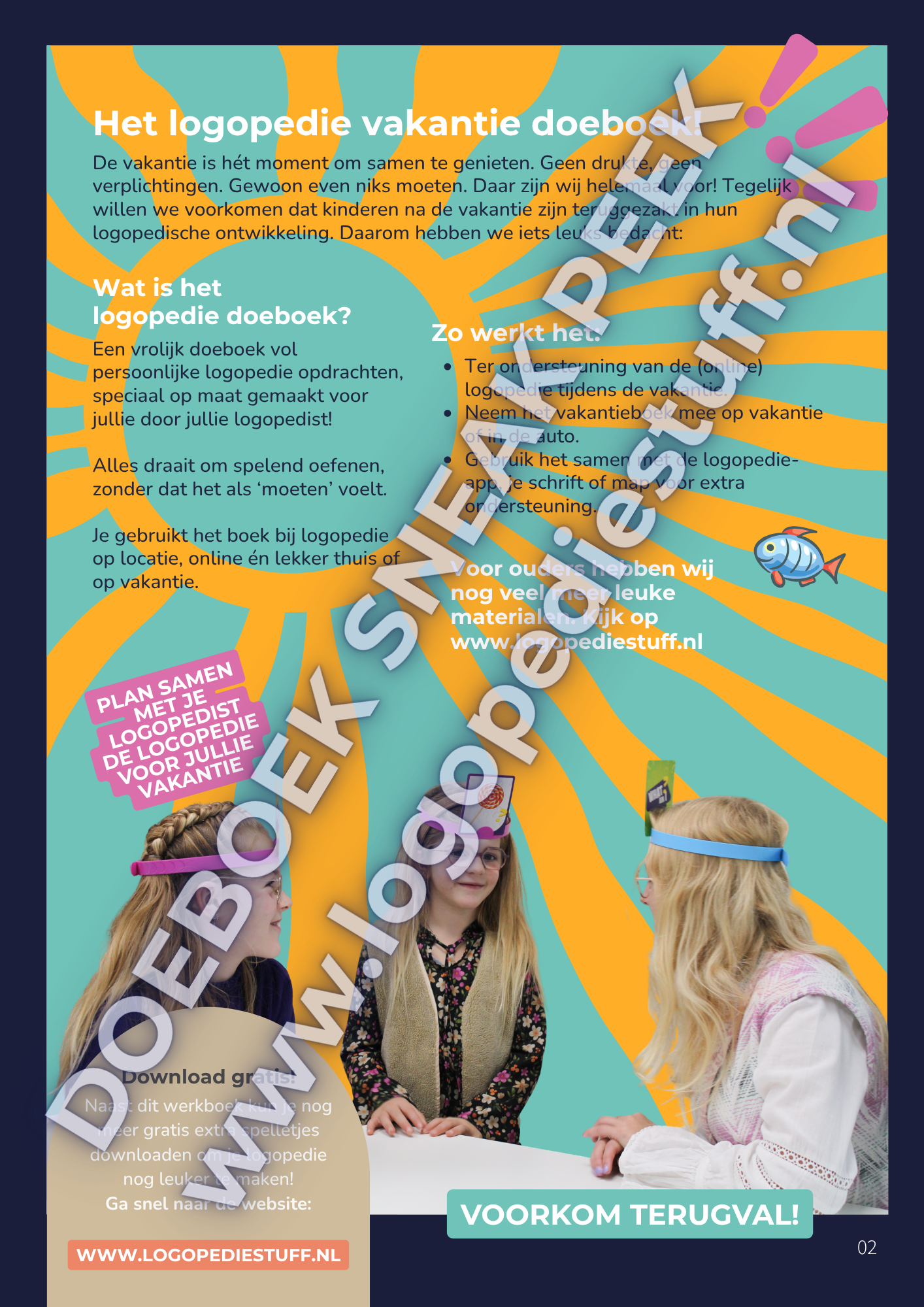 Vervolgens kunnen ouders thuis zelfstandig met het doeboek aan de slag. De opdrachten sluiten aan bij de ingevulde oefeningen, waardoor het oefenen in de vakantie direct gekoppeld is aan jouw logopedische doelen. Zo blijft de behandeling ook tijdens de vakantie effectief, overzichtelijk en leuk.